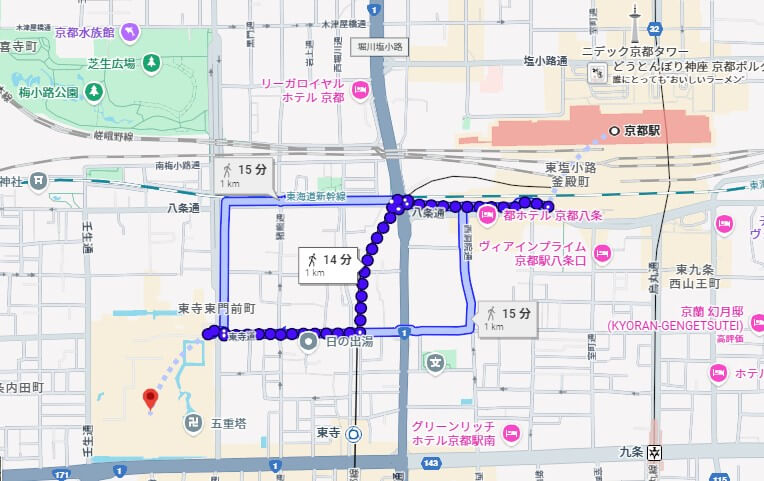 徒歩の場合は約15分、近鉄「東寺」駅を利用すると徒歩約10分ほどで、夜でも比較的わかりやすいルートです。