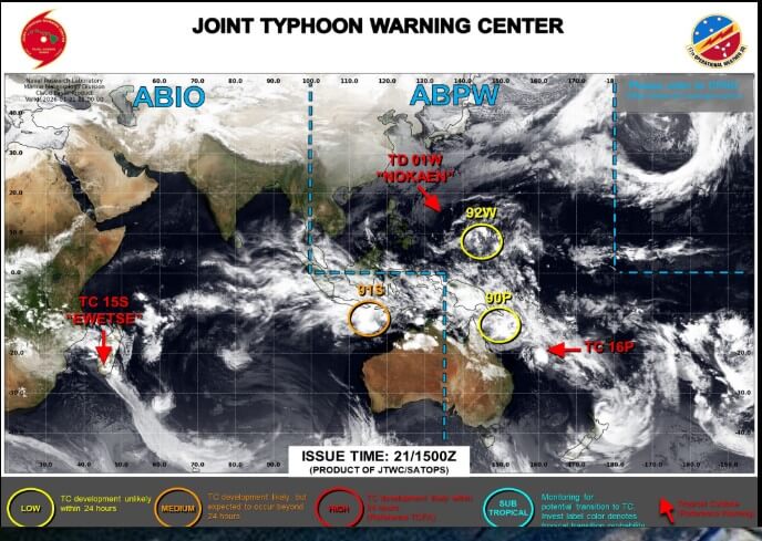下の画像は現地時間2026年1月21日15時00分(日本時間1月22日0時00分)の状況です。Tropical Depression 01W (Nokaen) こと台風1号ノケーンは熱帯低気圧となりフィリピンの東の海上に位置しています。